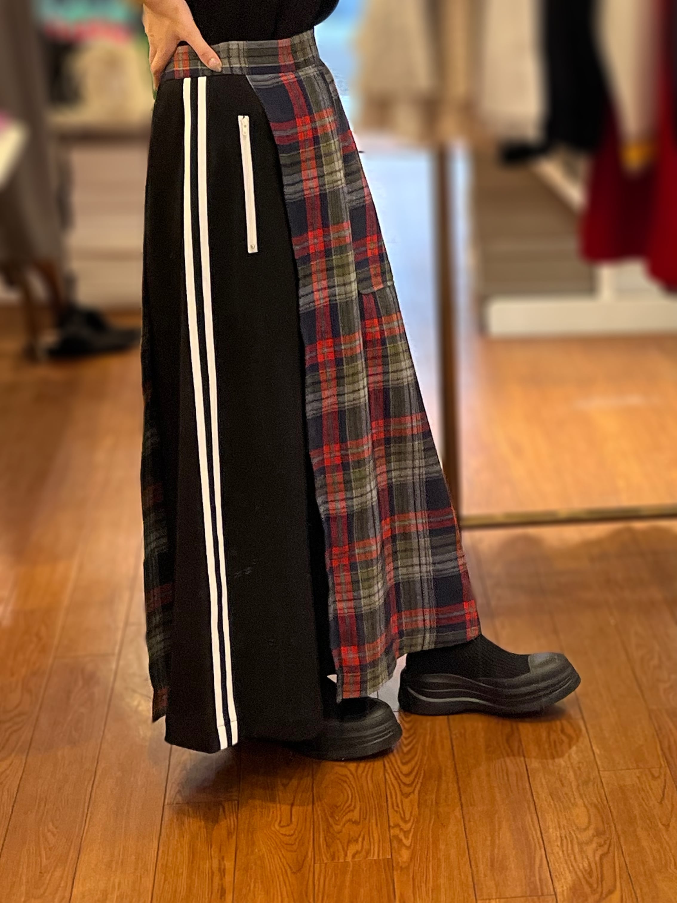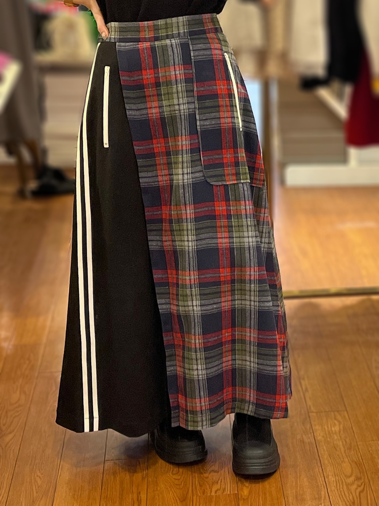 秋らしいチェック生地にサイドラインがドッキングされた華やかスカート。