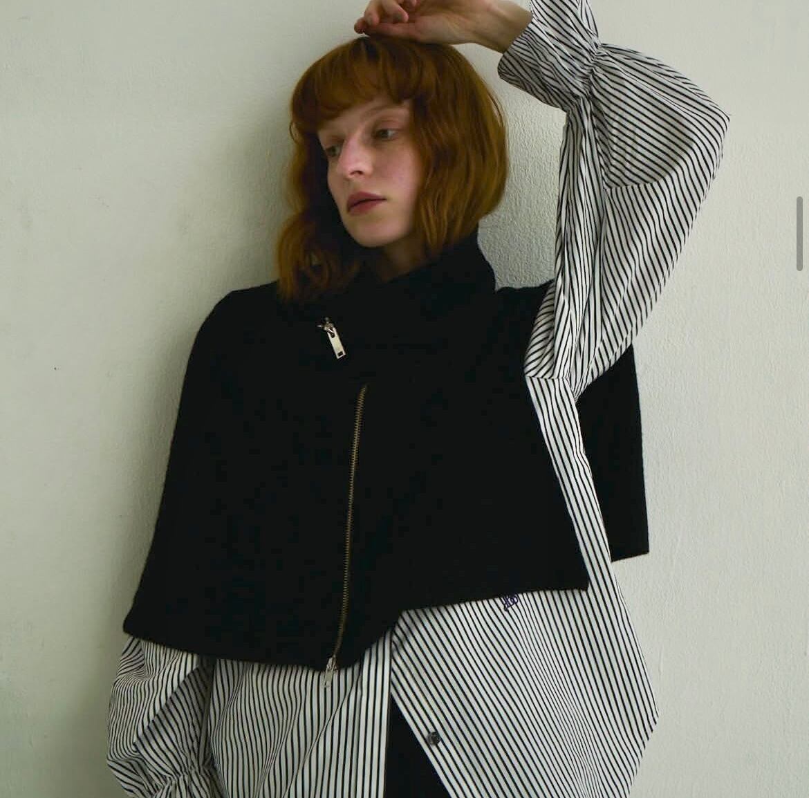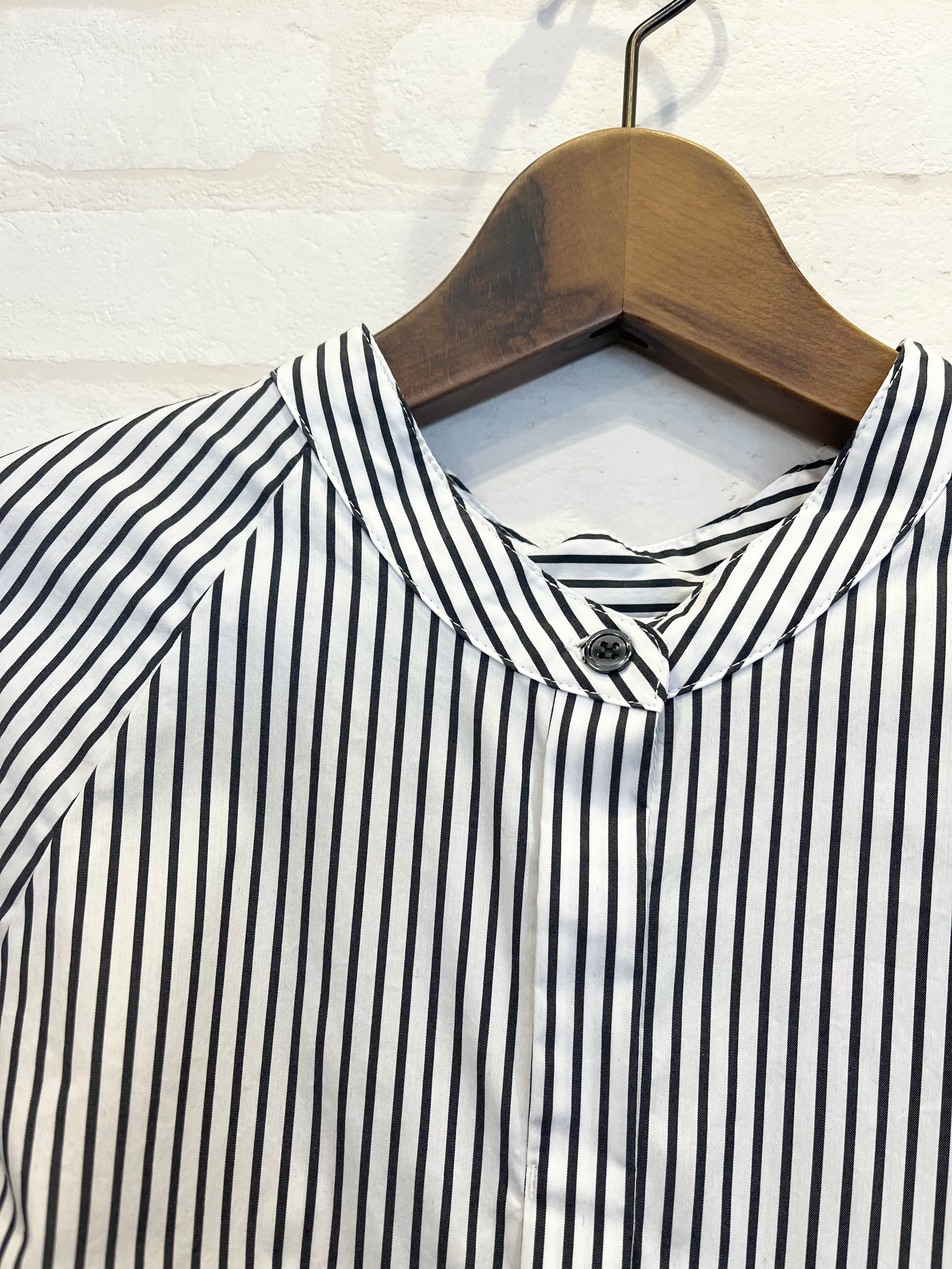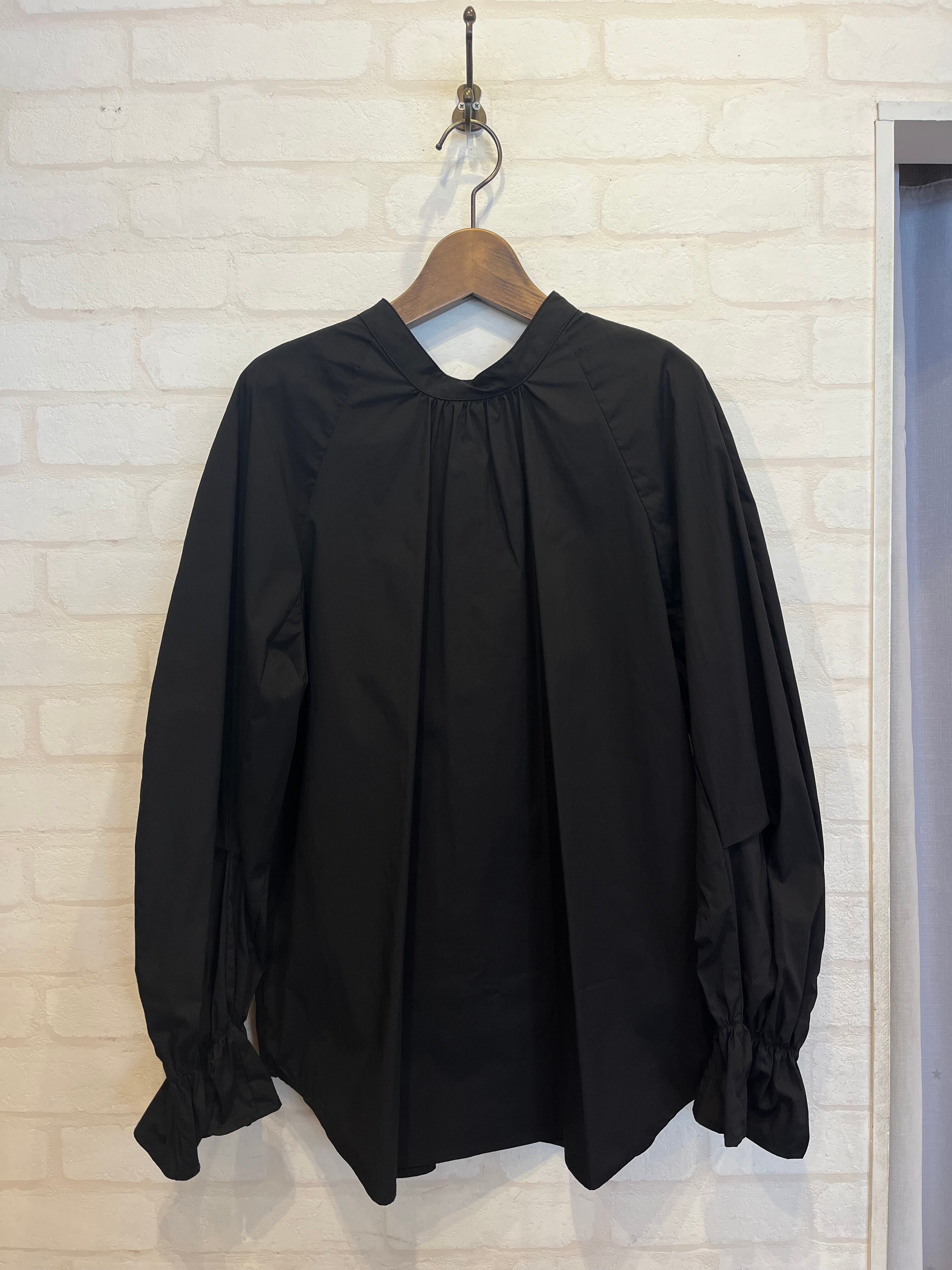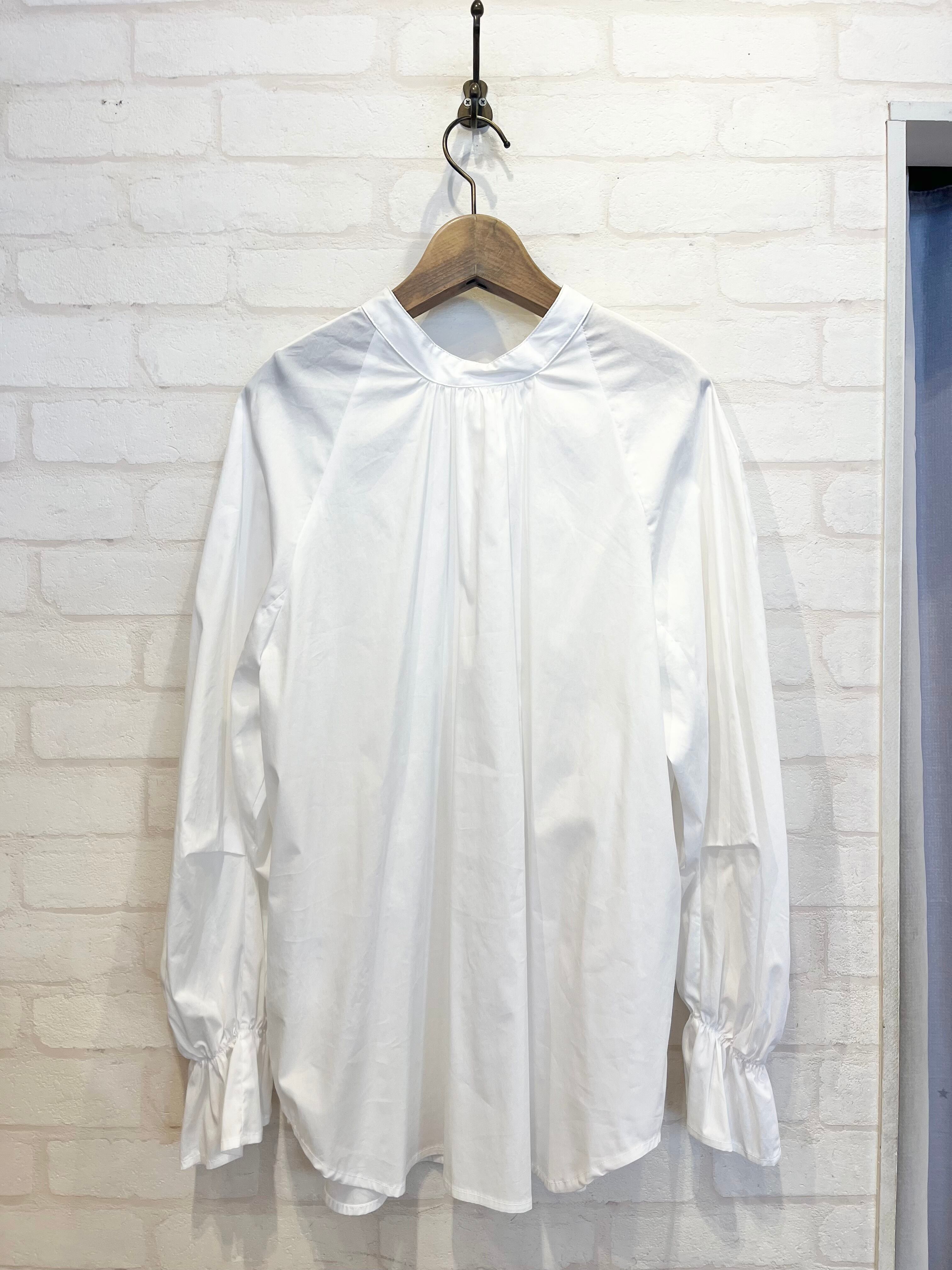 前後どちらでも着用可能な2way仕様のバンドカラーシャツ。ラグランスリーブにボリュームを持たせ、袖に特徴的なデザインを加えた1着です。