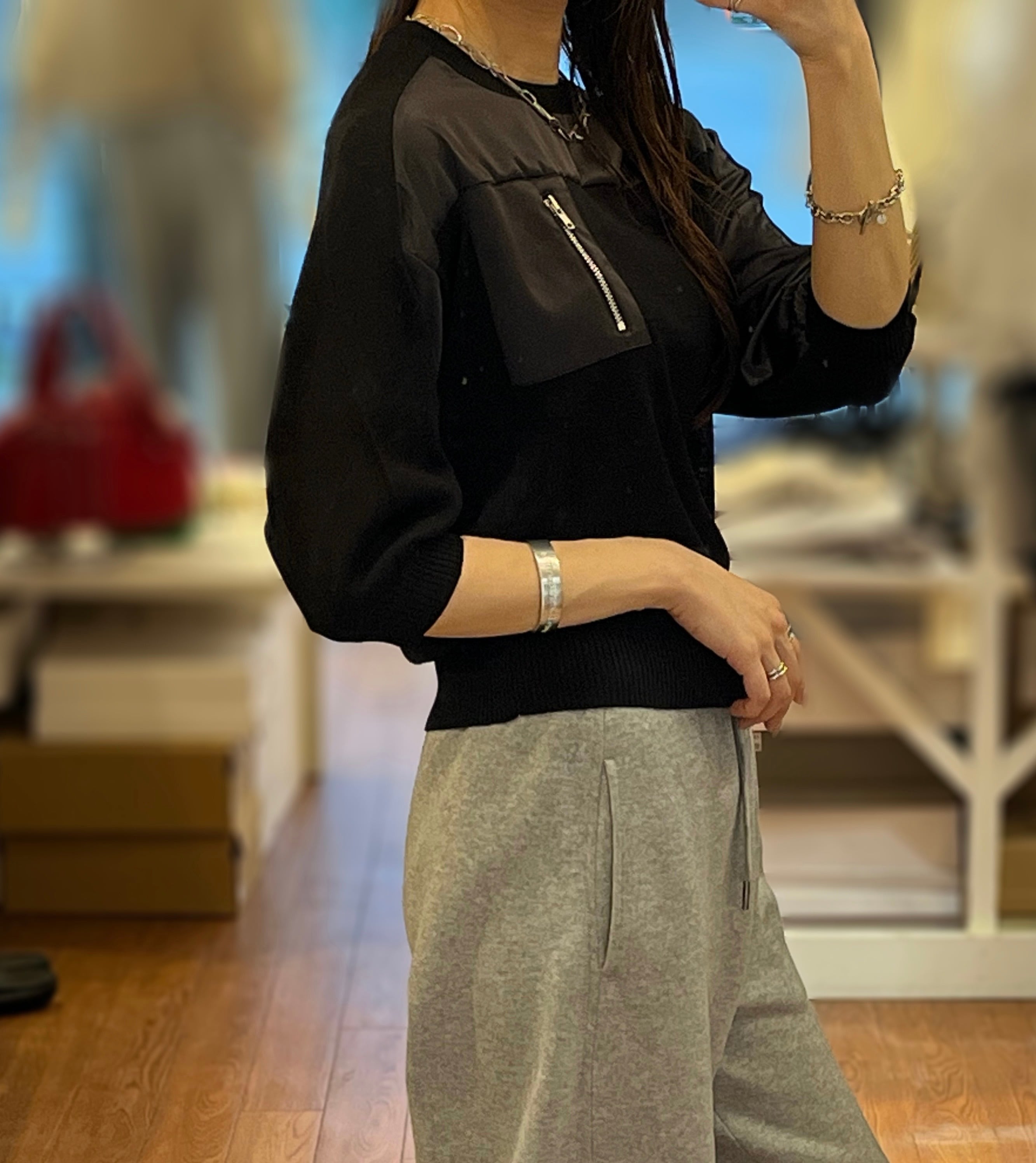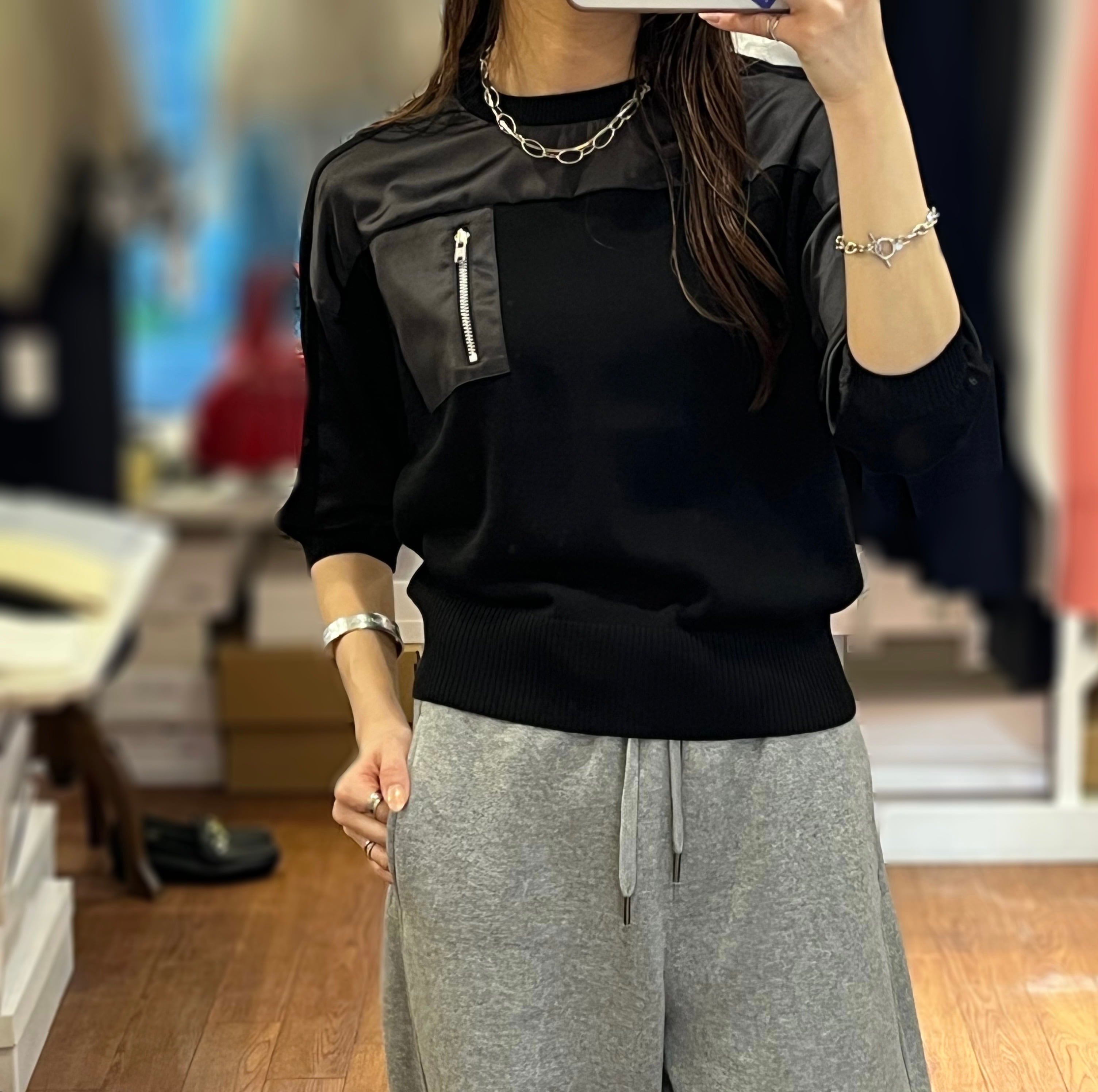 ミリタリーな印象のデザインとシアー素材を組み合わせたコンパクトなデザイントップス。