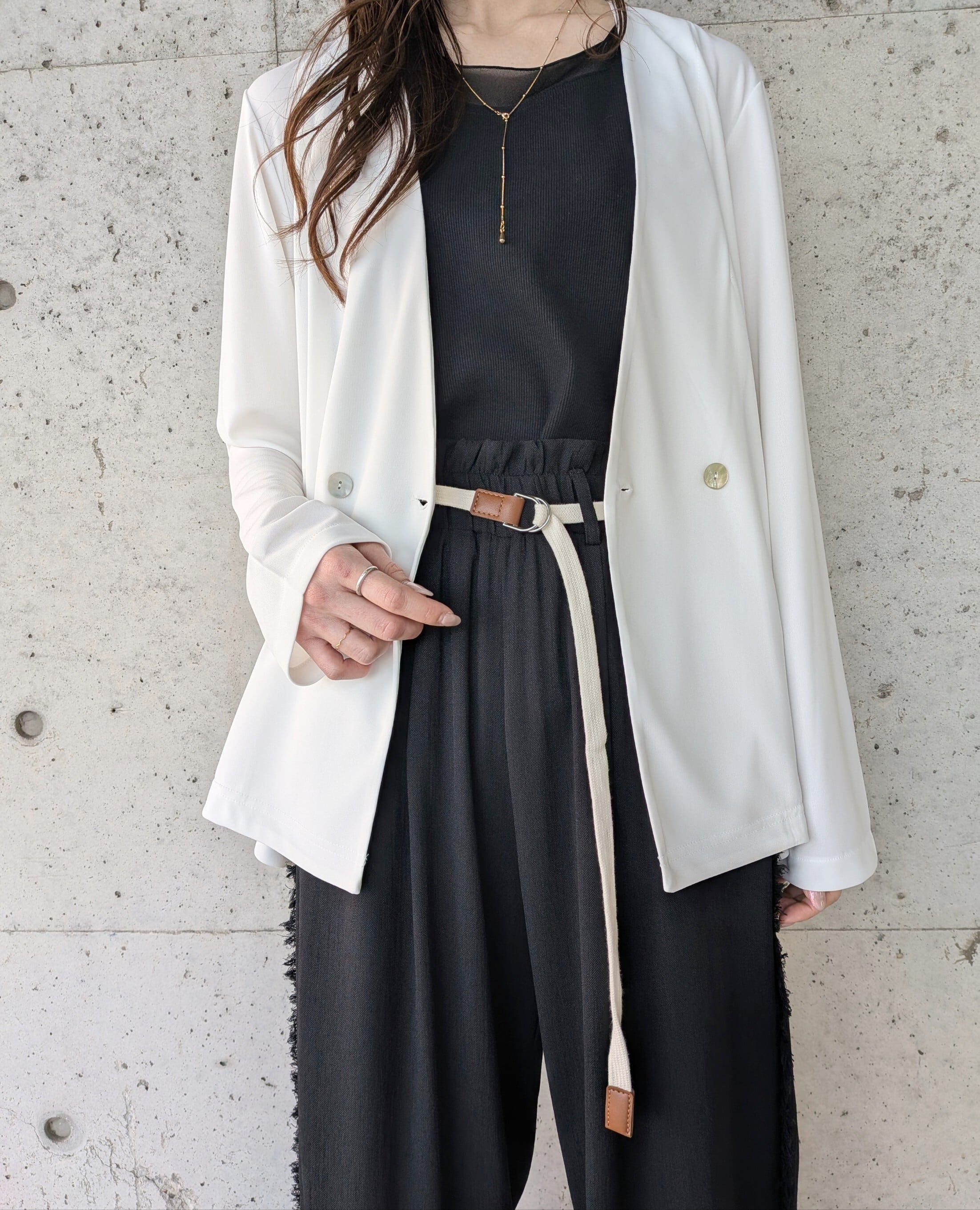 ノーカラーのダブルデザインで