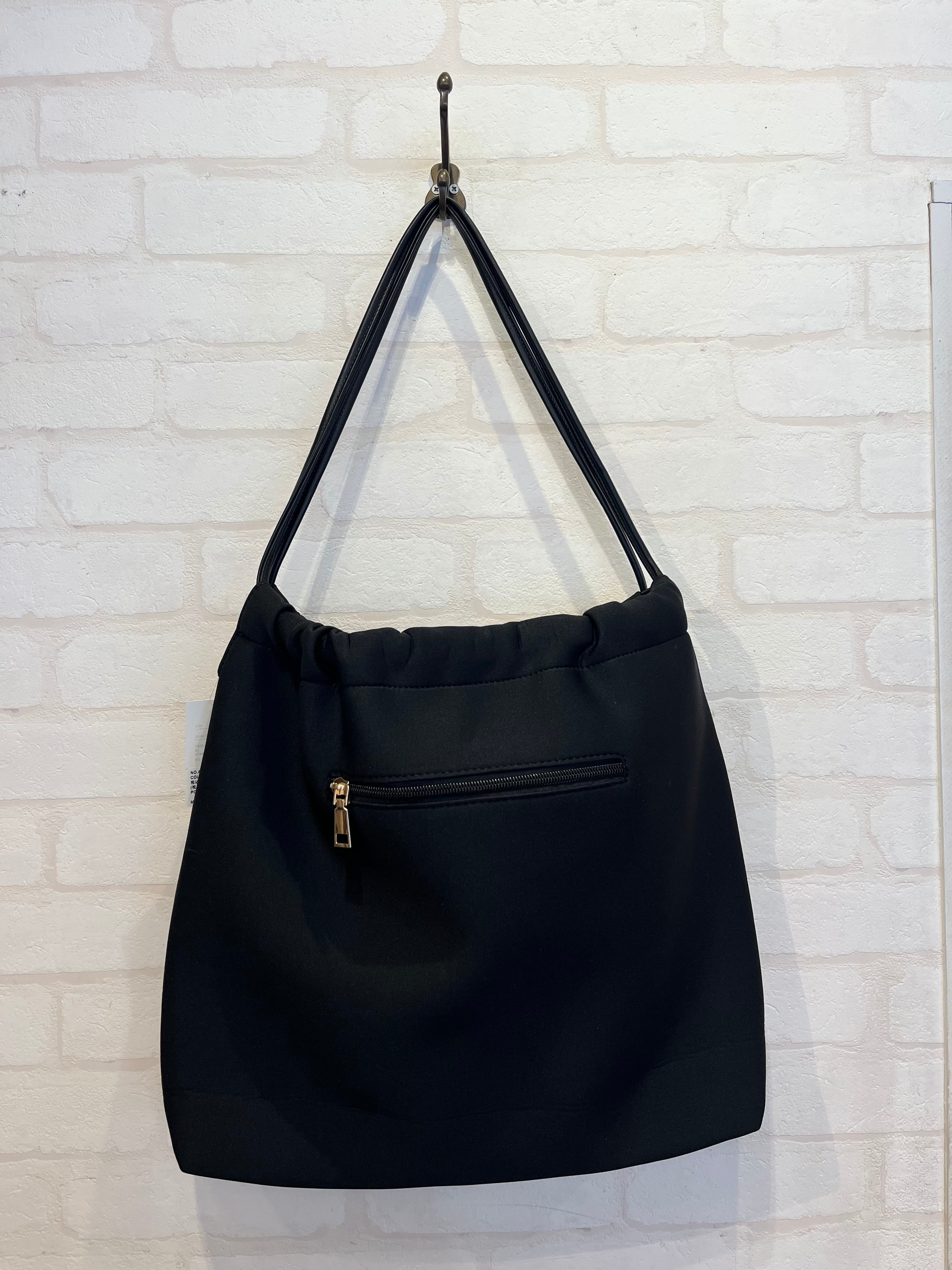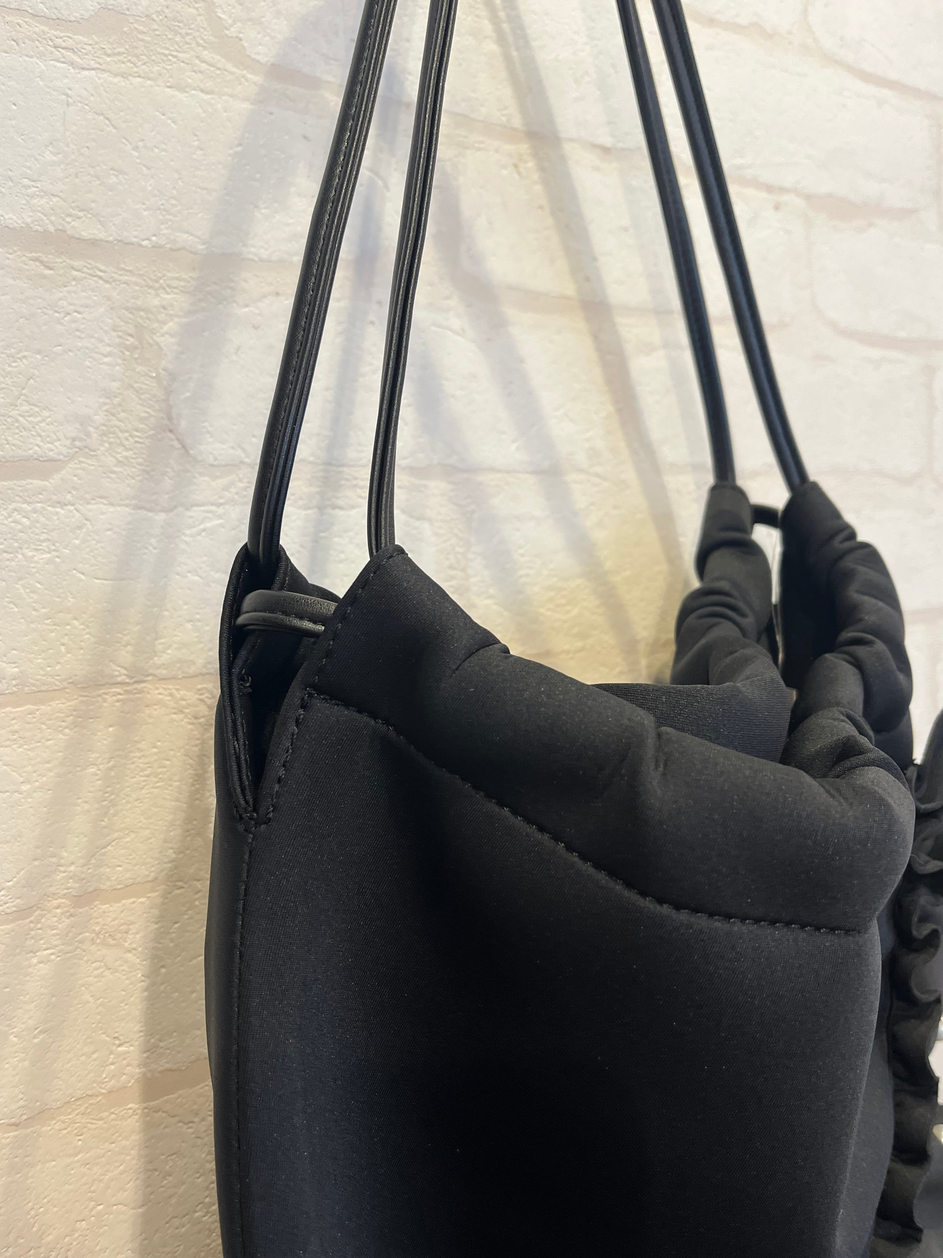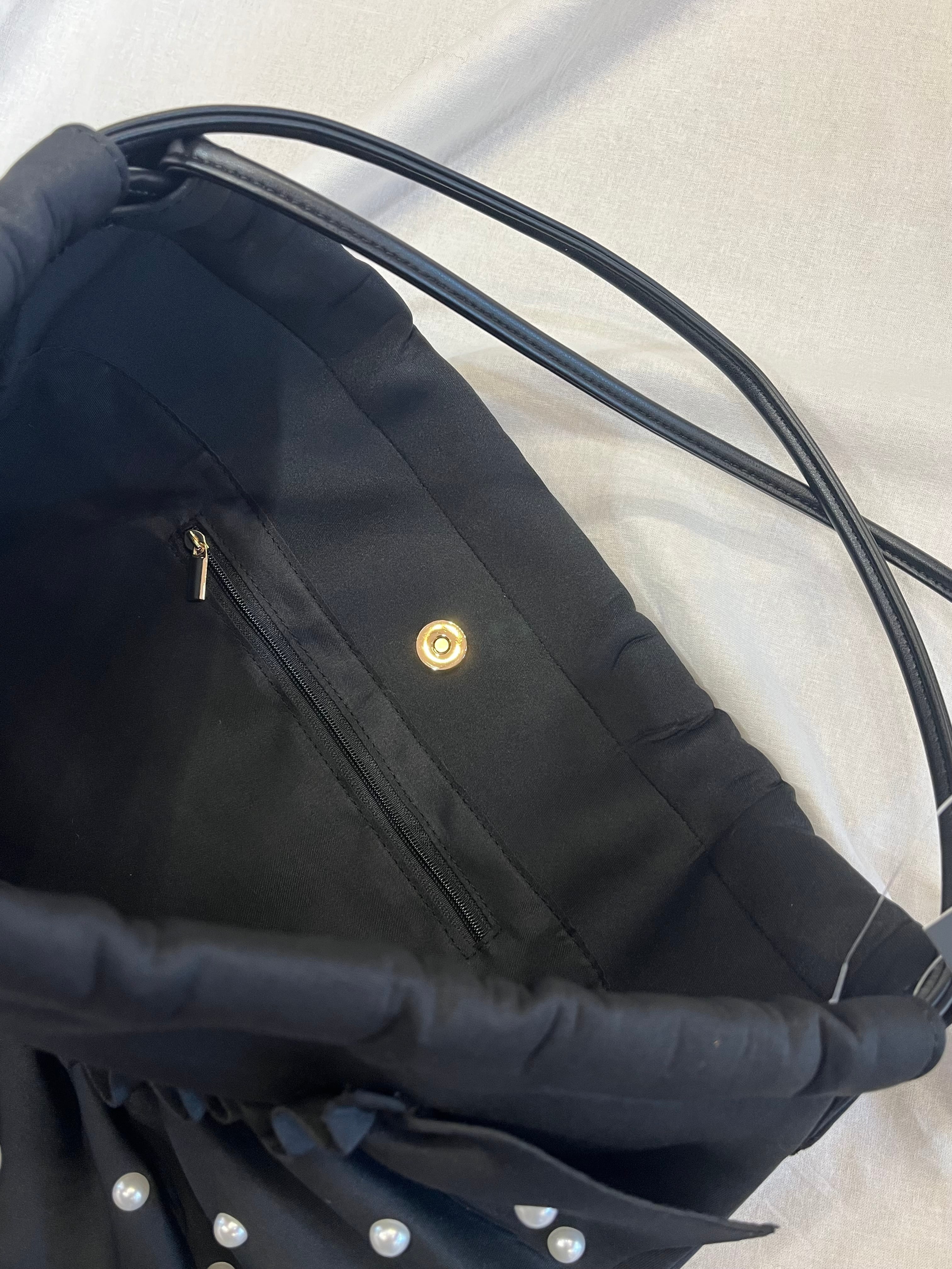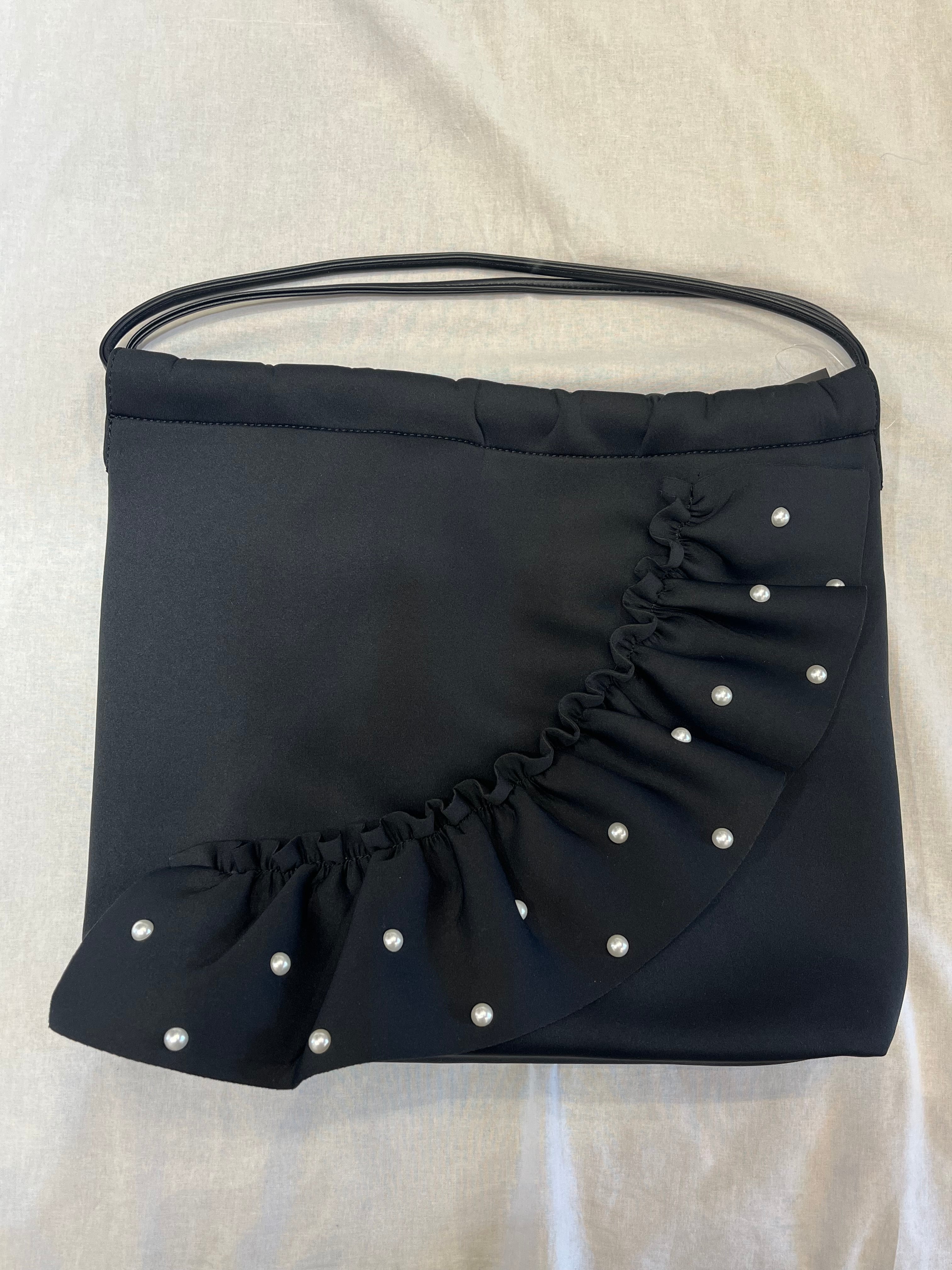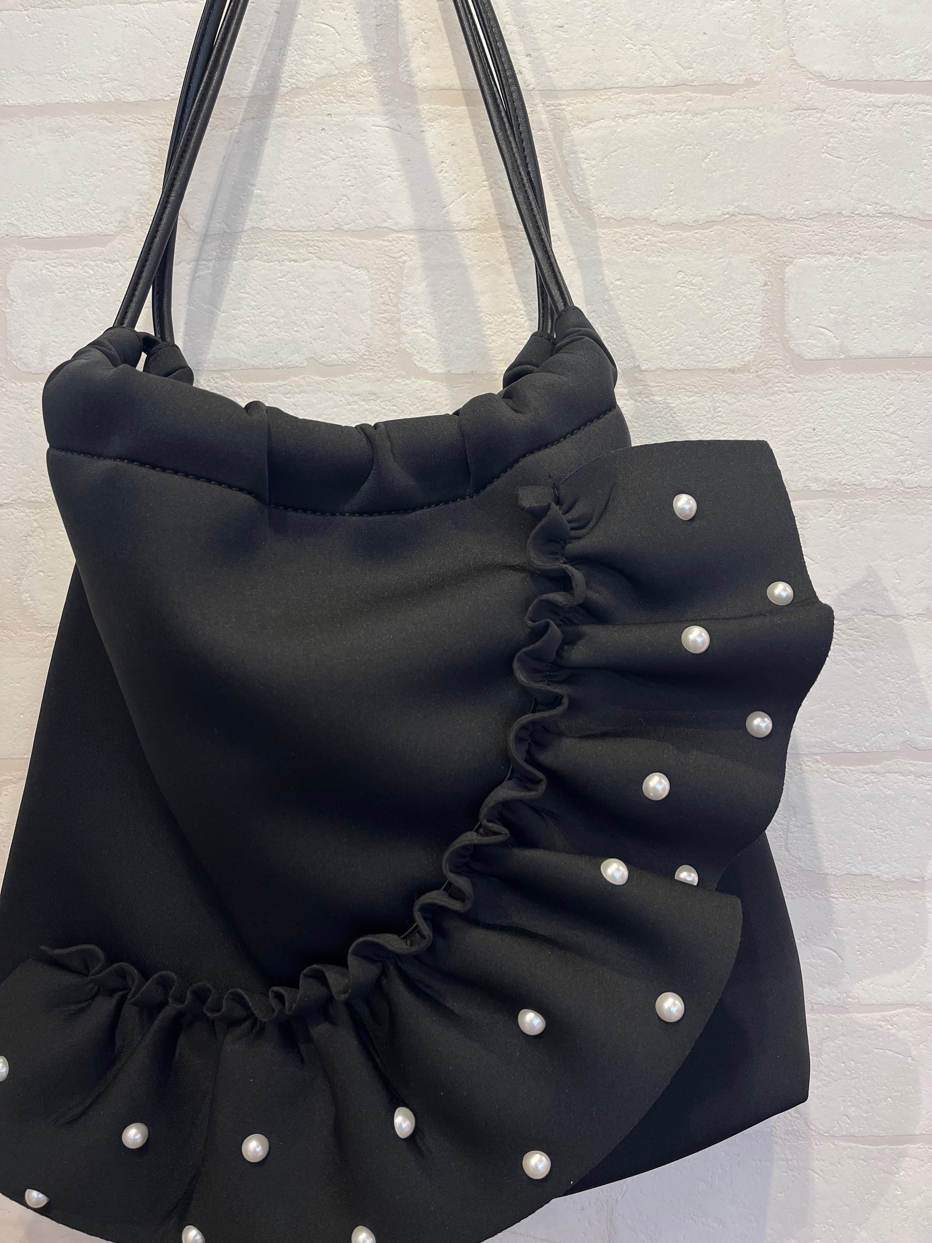 斜めフリルデザインにパールがあしらわれたウレタン素材のバッグ。